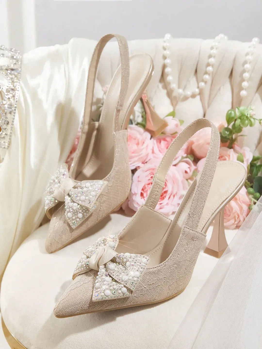 Sublimez votre tenue avec ces escarpins slingback beige avec nœud décoré de perles et strass 👠✨
